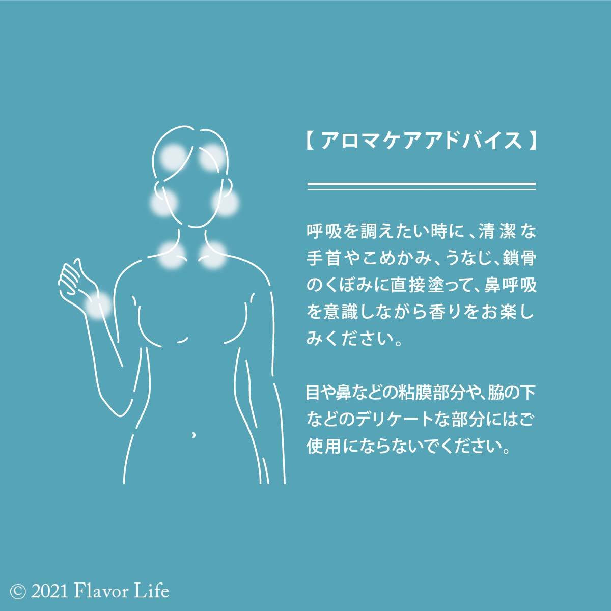呼吸をととのえたいときに、清潔な手首やこめかみ、うなじ、鎖骨のくぼみに直接塗って、鼻呼吸を意識しながら香りをお楽しみください。